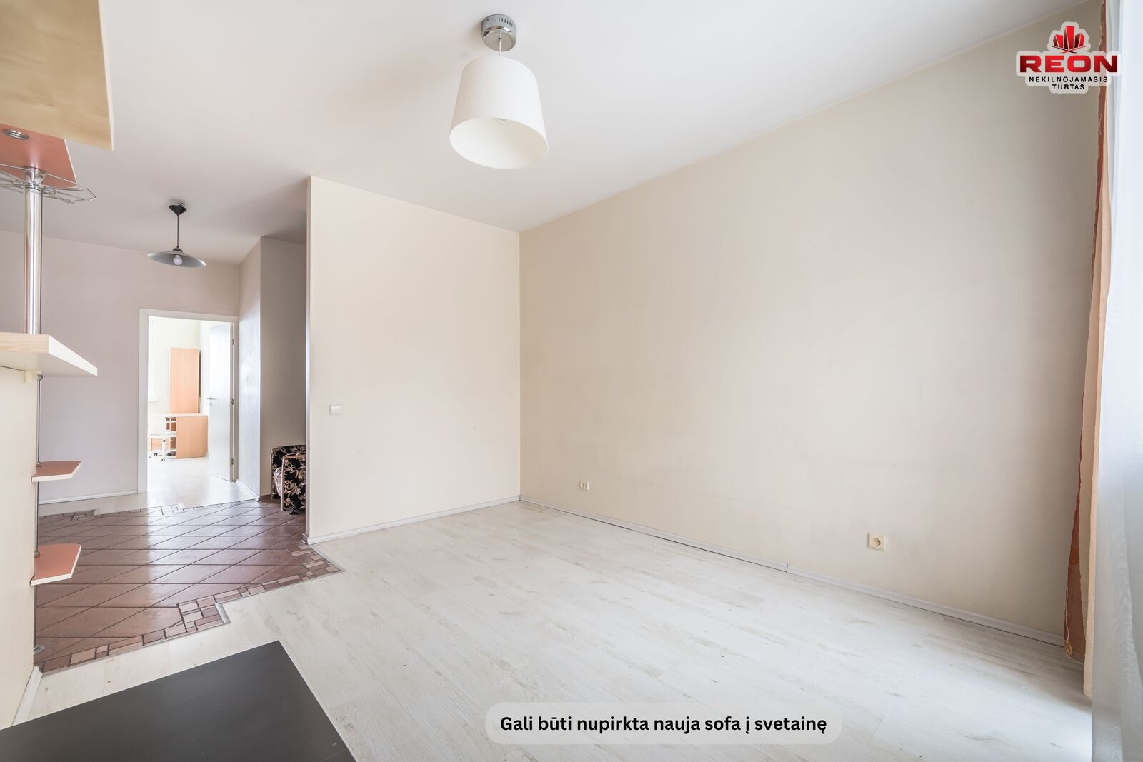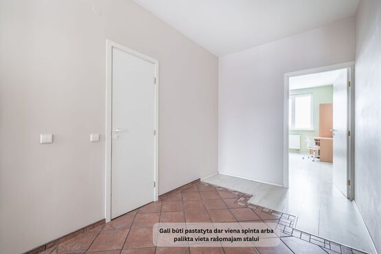 Svetainėje šiuo metu nėra baldų, esant poreikiui gali būti nupirkta sofa svetainėje, pastatyta dar viena spinta prieškambaryje.