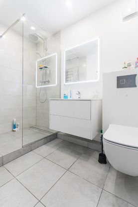-- Vonios kambarys: dušo kabina, gyvatukas, unitazas, kriauklė
