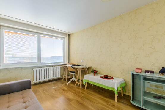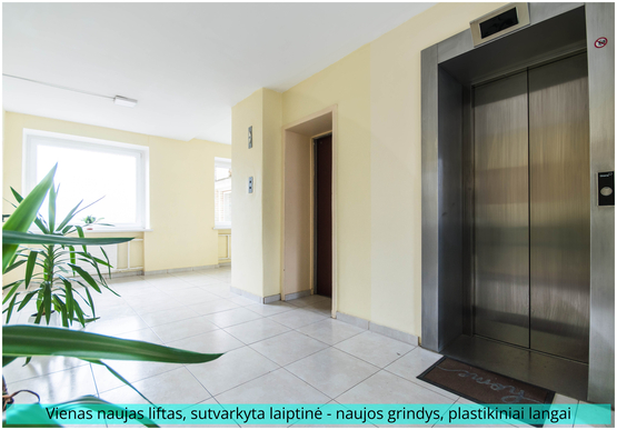 Name išmokėtas naujas liftas, sutvarkytas aukšto koridorius: dažytos sienos, lubos, plytelėmis klotos grindys, žaliuojantys augalai. Išplanavimas turintis potencialo tapti trijų kambarių butu.