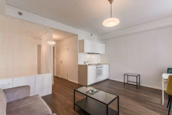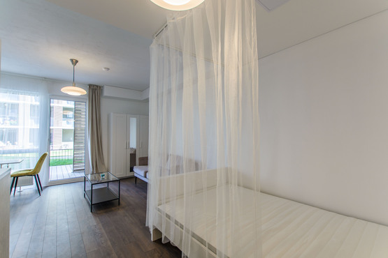 -- Miegamojo zoną atskiria užuolaida (esant poreikiui galima nusiimti ir turėti vientisą erdvę, arba pasikeisti į neperšviečiamas užuolaidas);